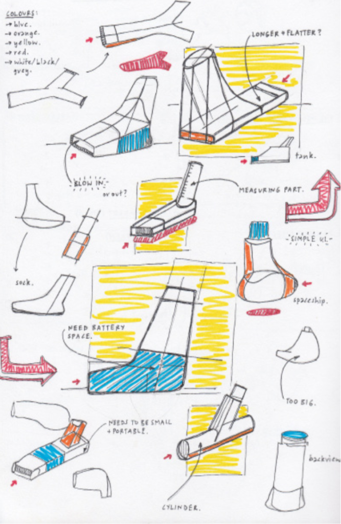 After conducting research into my target audiences of kids with asthma and their parents, I developed the design through sketching and user-testing the ergonomics. I used Autodesk Inventor to design and 3D-print and test different versions of the design.